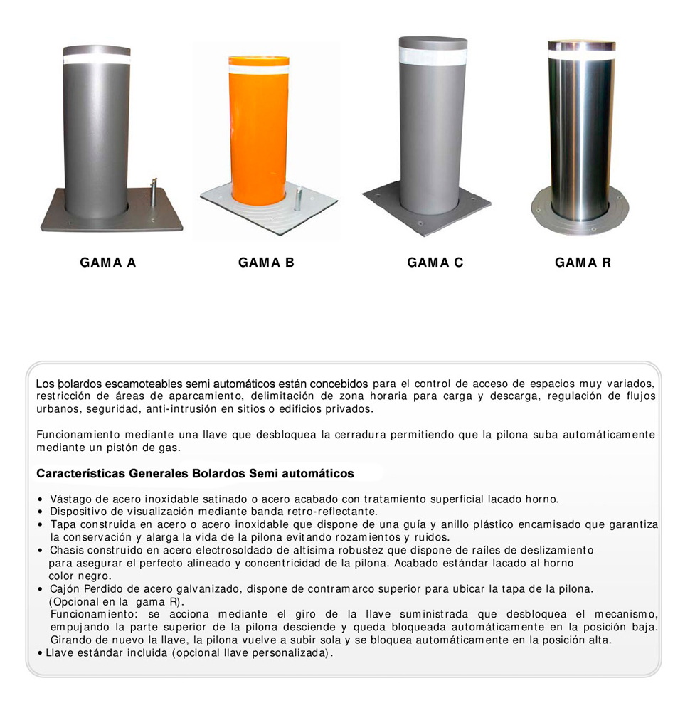 Los bolardos semi automáticos están concebidos para el control de acceso de espacios muy variados, restricciones de áreas de aparcamiento, delimitación de zona horaria para carga y descarga, regulación de flujos urbanos, seguridad, anti-intrusion en sitios o edificios privados.